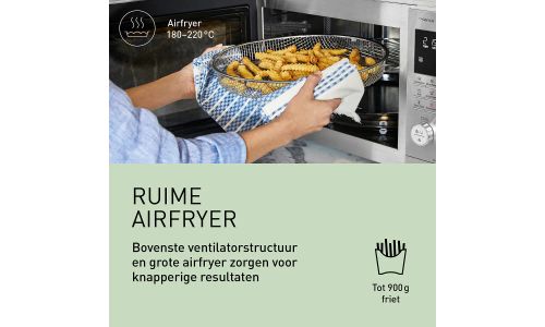 Zeg maar dag tegen rommel op het aanrecht. Met echte airfryer-resultaten uit de magnetron. De meegeleverde grote airfrymand kan zelfs maar liefst 900 g diepvriesfriet bevatten! De 3 verschillende temperatuuropties (180°C, 200°C of 220°C) zorgen samen met de bovenste ventilator voor een gelijkmatige heteluchtstroom, net als in een conventionele airfryer. Zo kun je gerechten frituren die iedereen lekker vindt, zonder dat je olie nodig hebt. Geen tijd- en kostenrovende voorverwarming nodig.